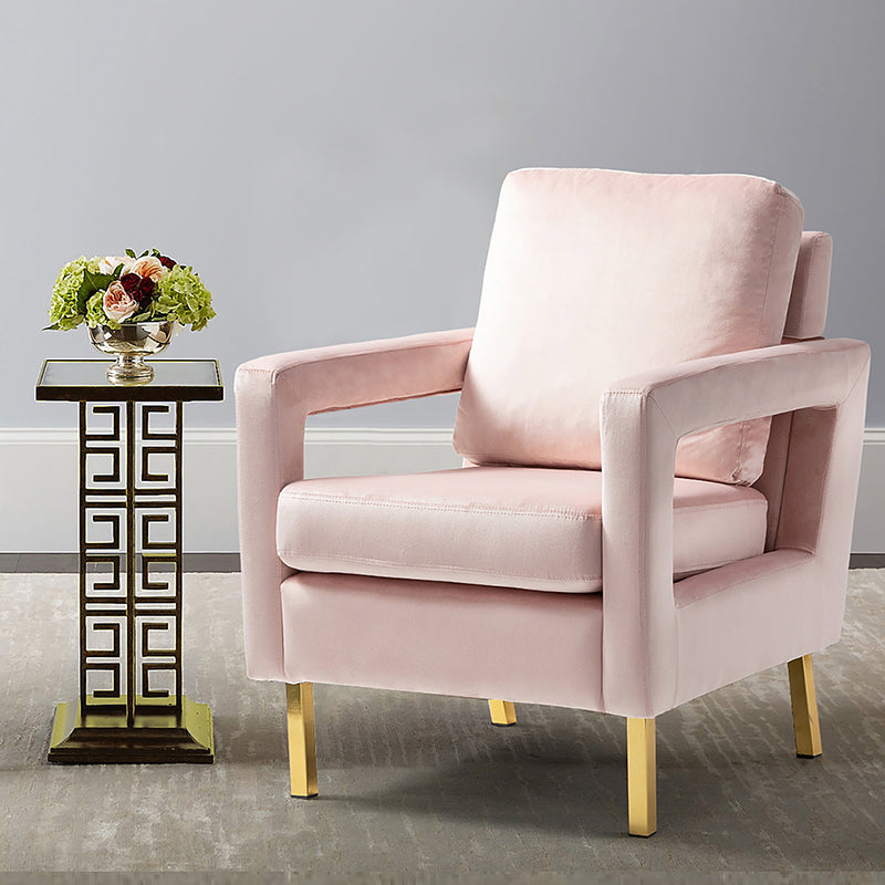 Elegant and eye-catching, the stunning modern accent chair with square open-framed arm is the perfect addition to any space. Made with premium velvet fabric, comfortable for skin touch. High-density foam filling with a solid wood frame provides comfort and support. Strength is offered by the stunning stainless steel legs, which feature a beautiful gold finish,this is the perfect pick for bedroom and living room.