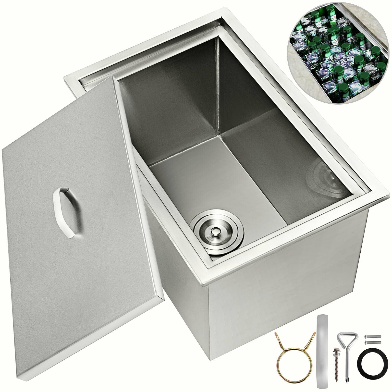 Product Description: Drop-In Ice Bin: Premium drop-in ice bin with 304 stainless steel material, which increases durability and ensures corrosion resistance. A high-quality cover is included to provide proper sealing and protect the ice from contamination. Keep wine in good taste and fresh, and let you have cold drinks at hand. A drain at the bottom of the bin helps to remove water. Perfect for outdoor kitchen, party, resort, bar, etc. Premium Material: Constructed of 304 stainless steel, it provides solid working construction and an overall silver bright appearance with an easy cleaning surface, suitable for both commercial and household use. Drop-In Design: The ice chest with cover is drop-in designed, easy to install in outdoor kitchens or bars, etc. Won't take up much space in the kitchen. Stainless Steel Cover: An included stainless steel lid prevents cold air from escaping and protects the ice from contaminants. The ergonomic handle on the cover for opening with a sleek and comfortable hand feeling. Considerate Detail: There is a drain hole at the bottom of the ice chest bin. A drain plug is provided, which can connect a pipe to drain water. It also can be used as an outdoor sink. Large Capacity: Overall Dimension: 21 x 16.8 x 17.6 Inches. Our stainless steel ice chest is large enough to hold most wine bottles. It can use as an ice cooler to keep beverages ice cold in good taste and fresh. Versatile Usage Place: The chest is an essential component of any foodservice establishment, offering a sturdy compartment for storing fresh ice cubes and beverages Volume Capacity: 92 qt.