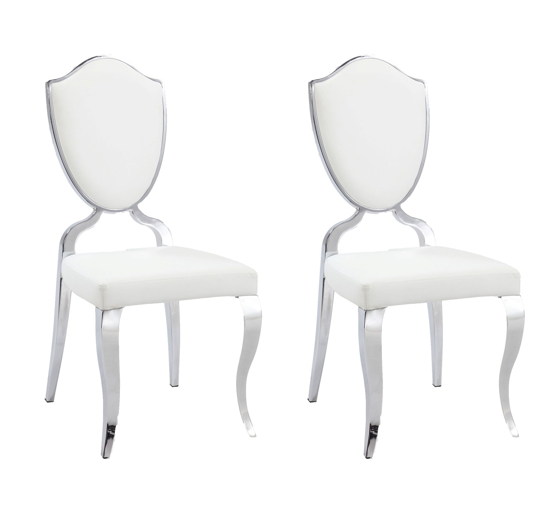 Introducing our exquisite Regal Side Chair, a true embodiment of elegance and sophistication. Designed with a shield-shaped back, this chair showcases a stunning white faux leather upholstery that exudes contemporary charm. The immaculate chrome finish of the cabriole style legs perfectly complements the overall aesthetic, adding a touch of modern glamour. Whether you're looking to elevate your dining area or create a stylish reading nook, this Regal Side Chair is a captivating choice that effortlessly blends sophistication with comfort.